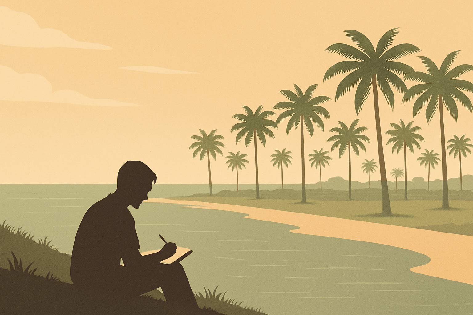 Sore ini, angin membelah barisan kelapa yang berdiri berjaga. Ombak berbisik perlahan, seolah mengiringi setiap kata yang saya tuliskan di jurnal ini—teman perjalanan yang setia sejak usia dua puluhan. Di senja yang meredup perlahan, saya menengok ke belakang—ke jalan setapak yang baru saya lalui: suka, duka, dan keputusan yang kadang ditetapkan dengan keraguan.